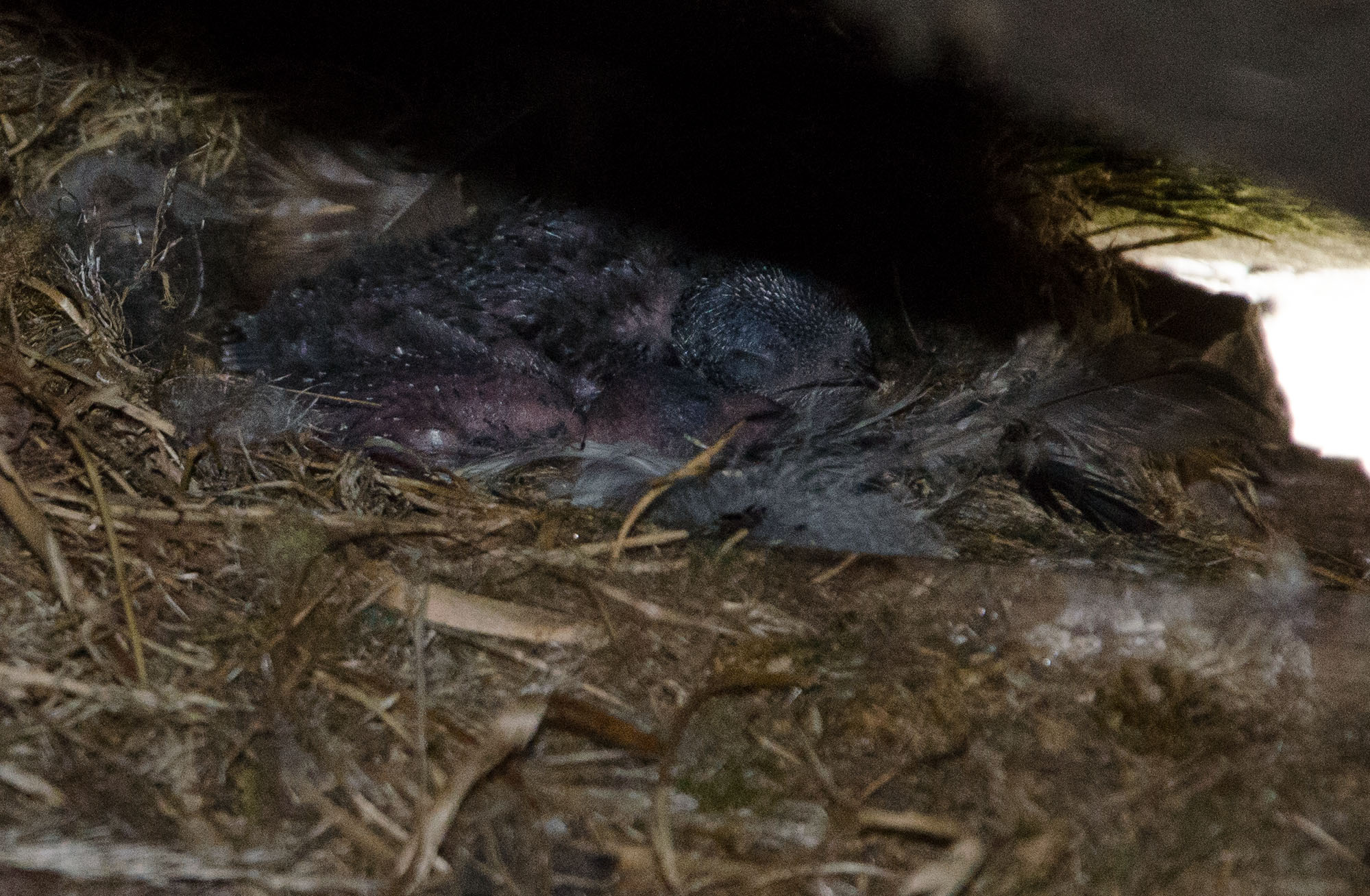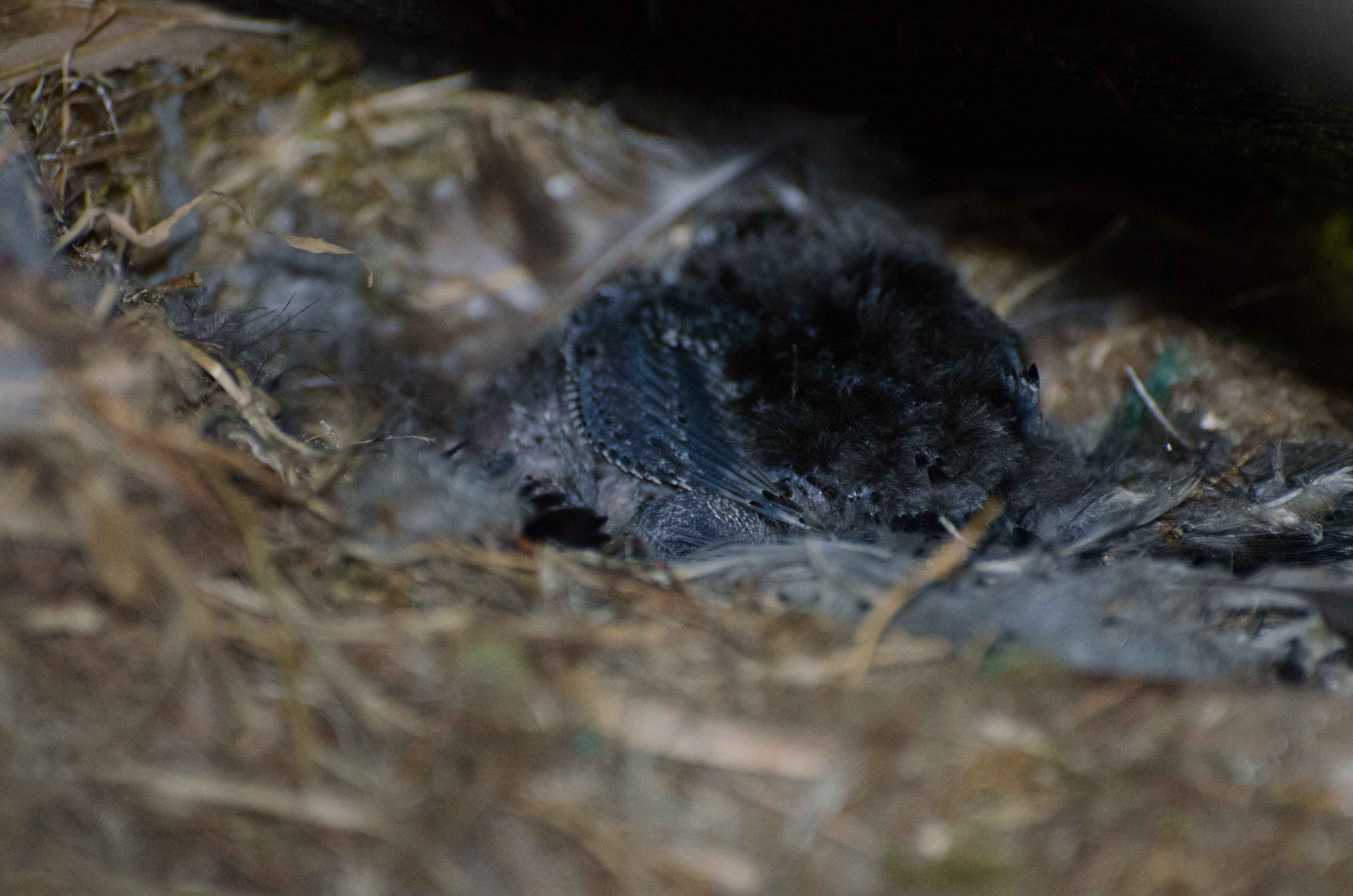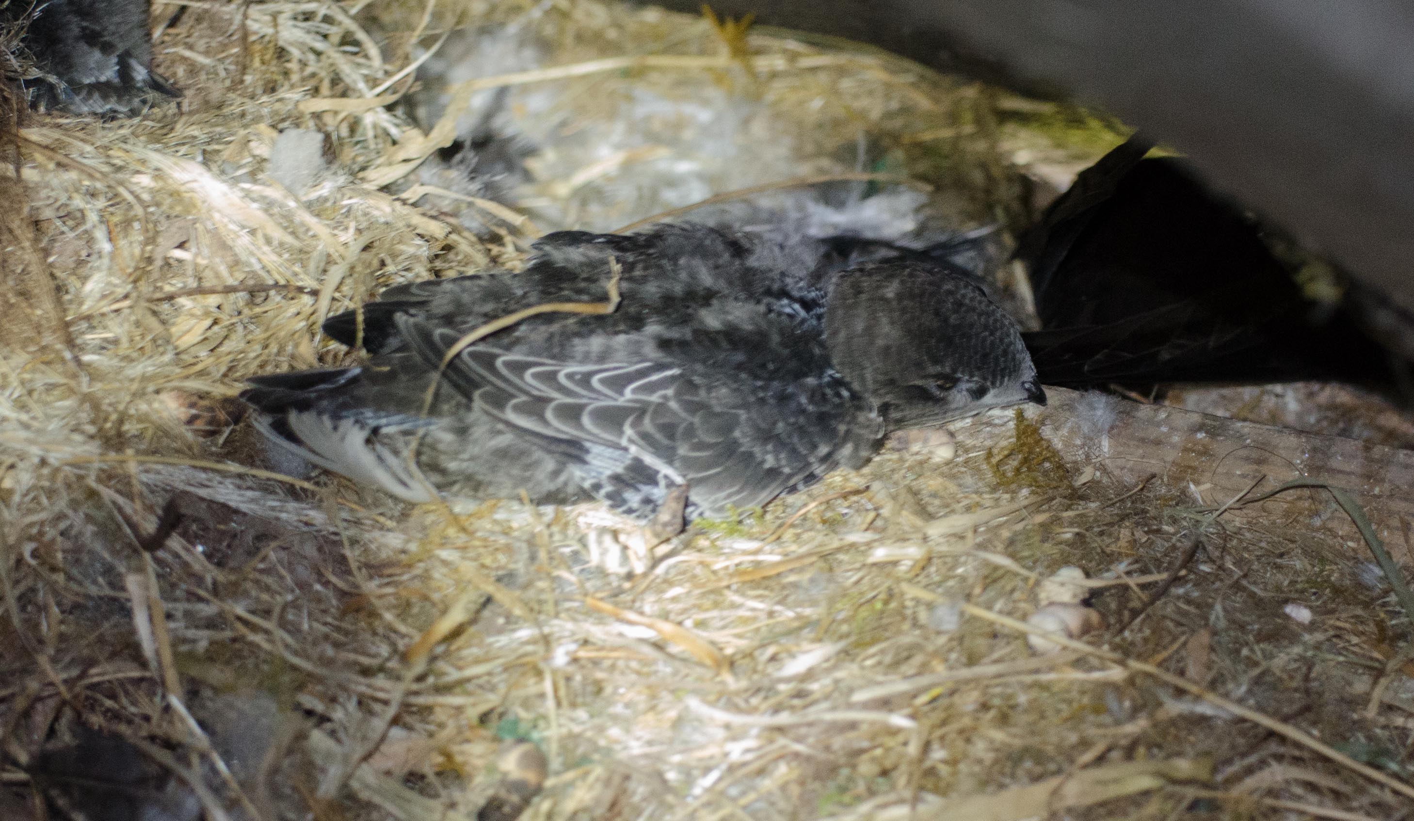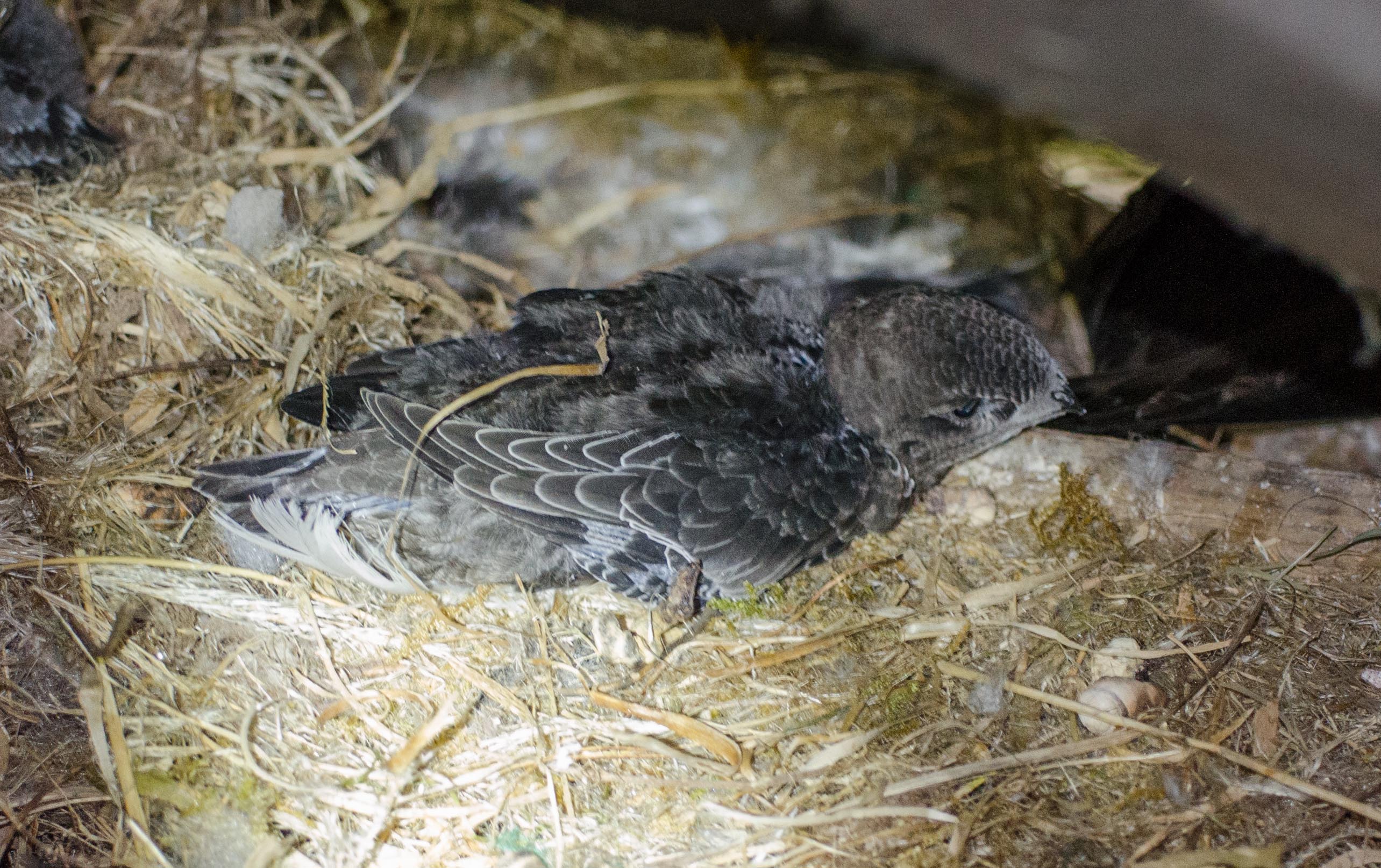 Another hot sunny day. Swifts were well fed, both of them getting several meals. I ventured into the attic space with my camera and managed a few good shots of the larger chick whilst one of the adults was present. The flash did not seem to disturb them. Her are 3 of them.