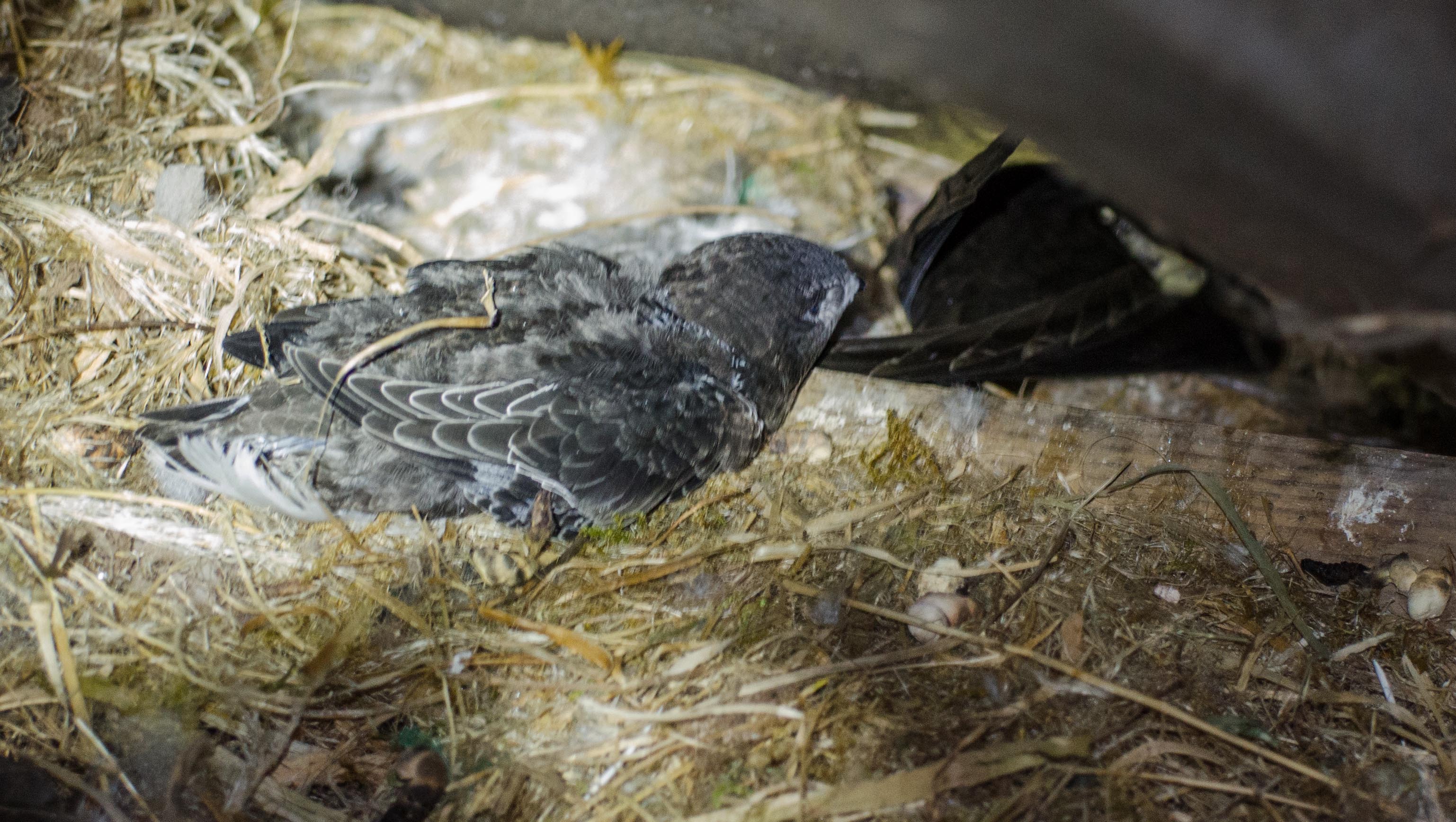 Watching them later they both went walkabout in the attic space. I was worried about the little one who seemed to fall some distance from the nest.